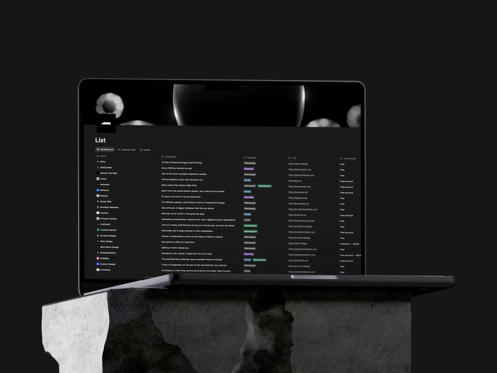 I’ve curated websites and platforms to help designers compare, get inspired, or simply share their work on the most relevant ones. Everything is sorted by name, category, cost to access resources, and cost to publish your work so you can find exactly what fits your needs.